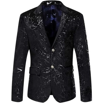 Men's Two Button Dress Party Blazer Black Floral Pattern Notched Lapel Stylish Suit Jacket