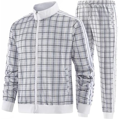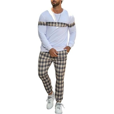 Mens 2 Piece Plaid Tracksuit Long Sleeve Pullover and Jogger Pants Sweatsuit Set