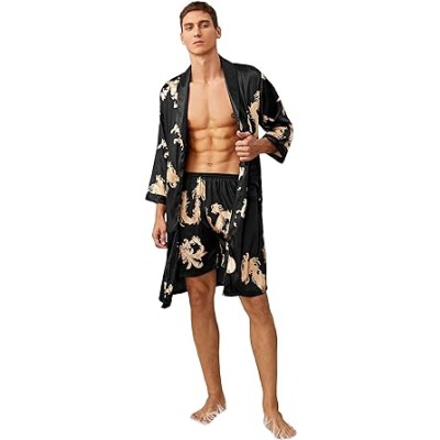 Men's Long Sleeve Silk Sleepwear Satin Kimono Robe with Shorts Pajamas Set
