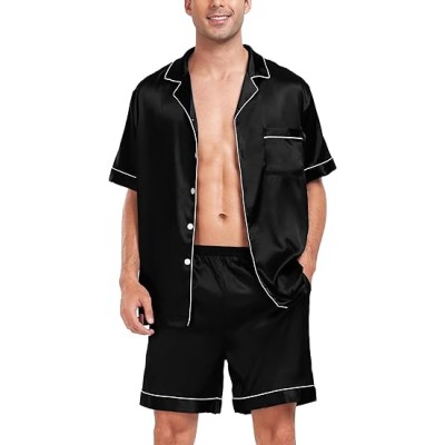Men Silk Satin Pajamas Sets Short Sleeve Sleepwear Button-Down PJs Sets Two-Pieces Loungewear with Pockets